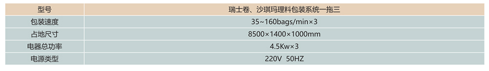 我们的理料包装系统中使用的包装机器可根据不同型号的瑞士卷、沙琪玛进行包装。机器有很高的自动化程度,包装速度和精度都非常高,除了标准配置之外,还可根据客户需求进行个性化定制服务。